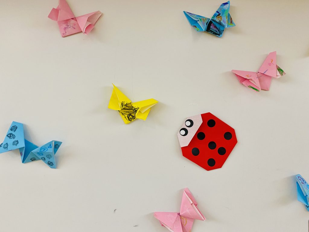 4歳・ゆり組の子ども達が折り紙でちょうちょを折りました。 先生に折り方を聞きながら丁寧に折り、折った後はクレヨンで模様をつけました。 ゆり組の壁に可愛らしく飾られているちょうちょ達。室内も、春らしさ満開です!