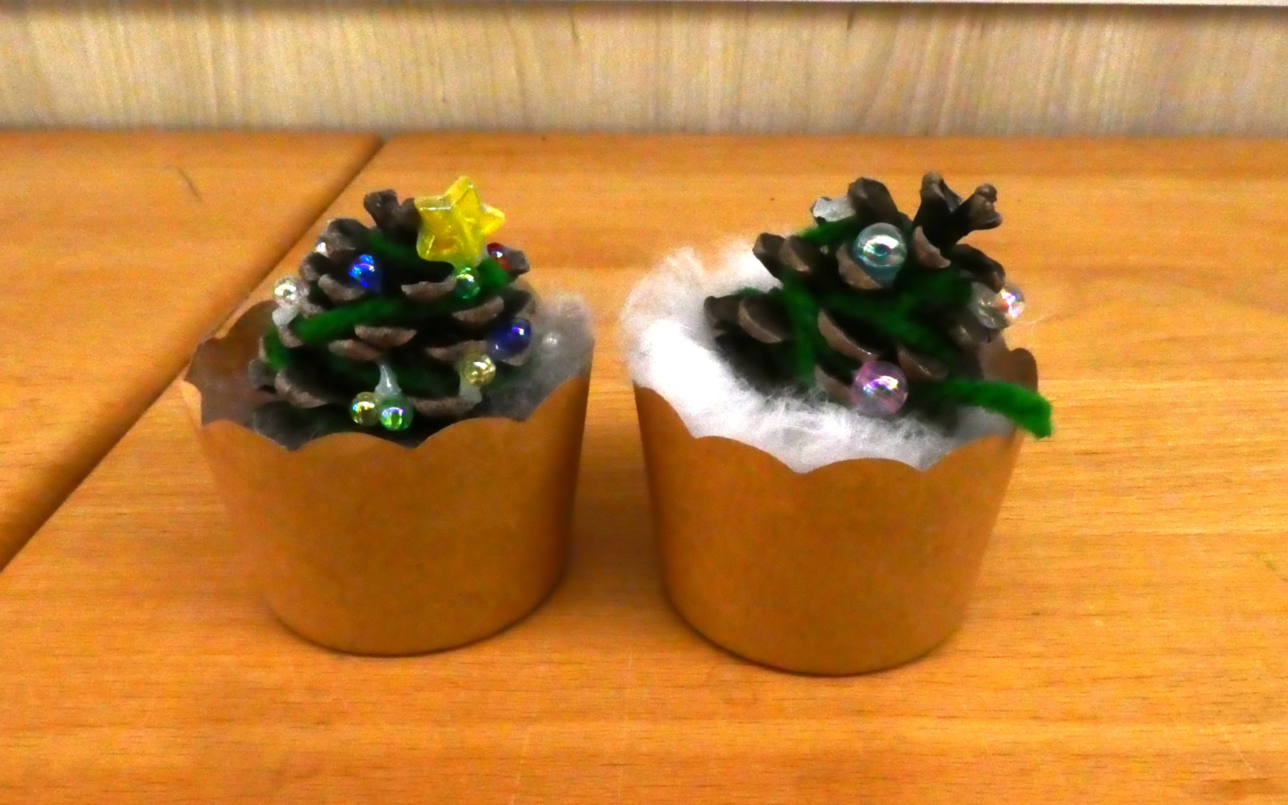 こちらは2歳・すみれ組が制作した松ぼっくりツリーです!